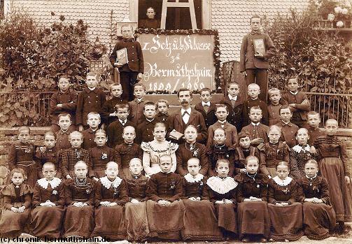 Die Oberklasse der Volksschule Bermuthshain mit den Geburtsjahrgängen 1886-1890 am 15. Juni 1899, aufgenommen anlässlich einer Schulvisitation. Die beiden besten Schüler erhielten an diesem Tag ein Buch überreicht. Oberste Reihe v. l.: Johannes Muth, Elisabeth Reuter (Ehefrau von Lehrer Reuter), Heinrich Oechler. Zweite Reihe v. l.: NN, NN, Jakob Lind, NN, Seligmann Lind, Benjamin Lind, NN, Johannes Lind, Karl Müller. Dritte Reihe v. l.: Heinrich Luft, Heinrich Bopp, Heinrich Groh, NN, Karl Jockel, Jakob Reuter (Lehrer), Johannes Luft, Jakob Lind, Johannes Weitze, NN. Vierte Reihe v. l.: NN, NN, Katharina Bopp, NN, NN, Wilhelmine Dillemuth, Christiane Oechler, Lina Oechler, Regina Lind, Elise Jost, Katharina Jockel, NN. Unterste Reihe v. l.: Frieda Lind, Lina Weitzel, NN, NN, Marie Mohr, Margarethe Bien, NN, NN, Bertha Oechler, Luise Luft, Marie Laufer.