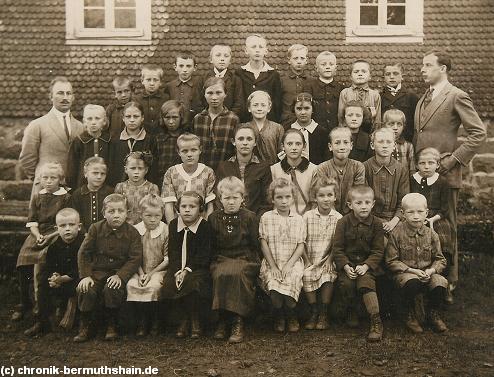 Ober- und Unterklasse (Geburtsjahrgänge 1914 bis 1922) der Volksschule Bermuthshain im Schuljahr 1927/1928 mit den beiden Lehrern Karl Winter und Paul Vogel. Oberste Reihe v. l.: Friedrich Oechler, Rudolf Oechler, Karl Jockel, Wilhelm Hornung, Otto Löffler, Wilhelm Schneider, Paul Lind, Otto Ortstadt, August Schäfer. Zweite Reihe v. l.: Karl Winter (Lehrer), Marie Blu, NN, NN, NN, Johanna Oechler, Frieda Luft, Lina Eschenröder, Frieda Löffler, Paul Vogel (Lehrer). Dritte Reihe v. l.: Lydia Weitzel, Emma Ortstadt, Gertrud Brückner, Erna Lind, Emma Schäfer, Katharina Jockel, Frieda Oechler, Katharina Bopp, Johanna Weitzel. Unterste Reihe v. l.: Heinrich Fölsing, Heinrich Löffler, Anna Bopp, Pauline Luft, Maria Bopp, Ottilie Oechler, Frieda Oechler, Emil Eschenröder, Ernst Kaufmann.