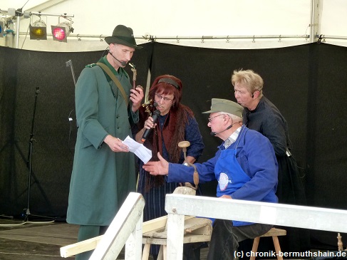 Impression von der Feststraße zur 1.000-Jahr-Feier am 19. August 2012: Das Theaterstück über den Bau der ersten "Schneeschuhe" (Skier) im Vogelsberg durch Holzdrechsler Friedrich Jost und Förster Wilhelm Dillemuth im Jahr 1886.