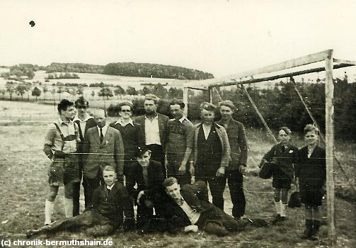 Fußballer des ersten Bermuthshainer Sportvereins auf dem Sportplatz in Nieder-Moos um 1946. Stehend v. l.: Karl Düßel, Helmut Imhof, NN, Heinz Joswig, NN, Gerold Wettengel, NN, Heinrich Zimmer, NN, Richard Götz. Liegend bzw. kniend v. l.: Ernst Lind, NN, Hermann Götz.